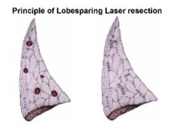 To be able to remove the metastases, the chest is opened by making a small lateral cut (for women in the breast fold). Subsequently, the half of the lung that is affected is disconnected from the air supply, which results in it shrinking to about one third of its ventilated size. In this condition, it can be felt with precision by an experience thoracic surgeion for metastases up to a size of one millimetre. This means that the examination during surgery is even more precise than the examination technique common today with a spiral computer tomogram that records metastases up to a size of three to five millimetres. The metastases there by localised (or tumours of another type) are then circumvented with the laser ray at a small safety distance and cut out of the healthy lung tissue. As this is a so-called photothermal removal of the metastases, this means that during the cutting out, temperatures are reached of up to 300 degrees celsius, the safety distance and therefore the tissue loss can be kept small, because at such high temperatures tumour cell spreading can be virtually ruled out. Nevertheless, all materials and metastases removed can be examined by the pahtologist microscopically and in an immune histochemicall manner. In such a way, metastasis for metastasis is removed from the relevant segments of a lobe of the lung and - where required - further lobe for lobe (three lobes on the right, two lobes on the left) are cut out and the function of the remaining lobe remains preserved. After removing the metastases, lymph nodes are then removed from all key areas, as their examination provides further information. If both lungs are affected with metastases for a patient, the more strongly affected side is started on. Once the side subjected to surgery has then recovered after about four weeks, the second lung is subjected to surgery in the same way. This procedure is particularly gentle, avoids complications and maintains a high level of quality of life for the patient also in the event of a large number of metastases. Finally, this tissue-spanning and gentle laser surgical method opens up the possibility of a second, third or even fourth course of treatment, if metastases again occur in the further process.